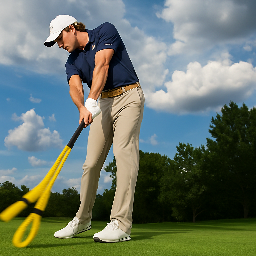 ゴルフのスイングに必要な腕力を集中的に鍛えられるロープ式のトレーニング器具です。
