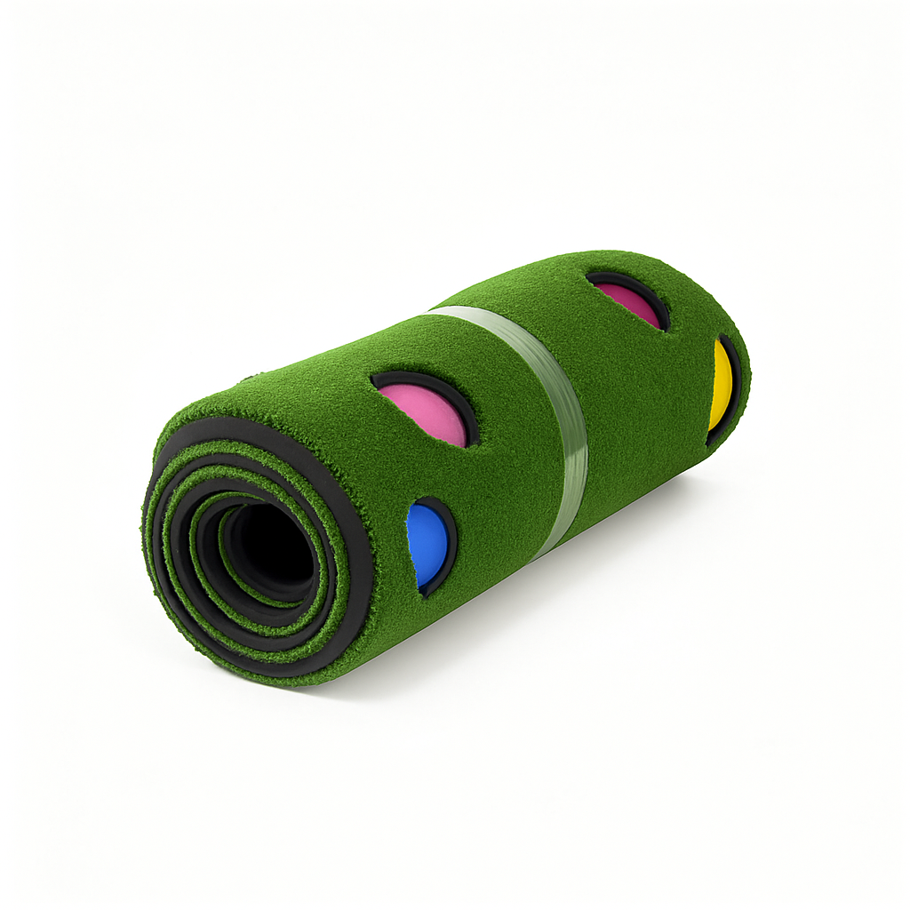 自宅で本格的なパター練習ができるゴルフ練習器具です。 人工芝製のマットには複数のカップ穴が配置され、様々な距離と角度からの打ち分け練習が可能です。 起伏のある形状で実戦に近い感覚を養え、収納時はコンパクトに巻いて保管できます。 初心者から上級者まで幅広く対応し、毎日の反復練習でスコアアップを目指せます。 室内でも気軽に使用でき、天候に左右されずパッティング技術を磨くことができる練習用品です。