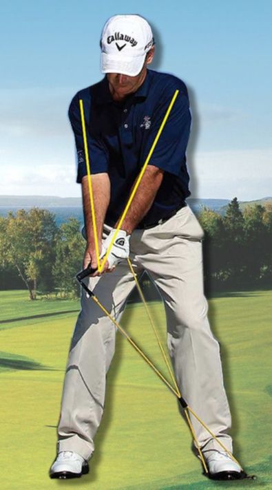弾性紐の抵抗を利用して正しいスイング軌道を身体に覚えさせるゴルフ練習器具です。