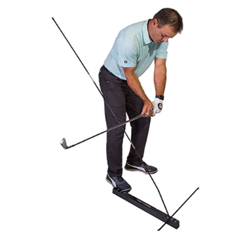 足元の三角形ガイドマットが正確なスタンス位置を示し、垂直に伸びる棒が体の軸や前傾角度の確認をサポートします。