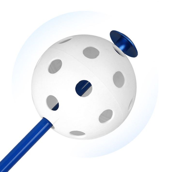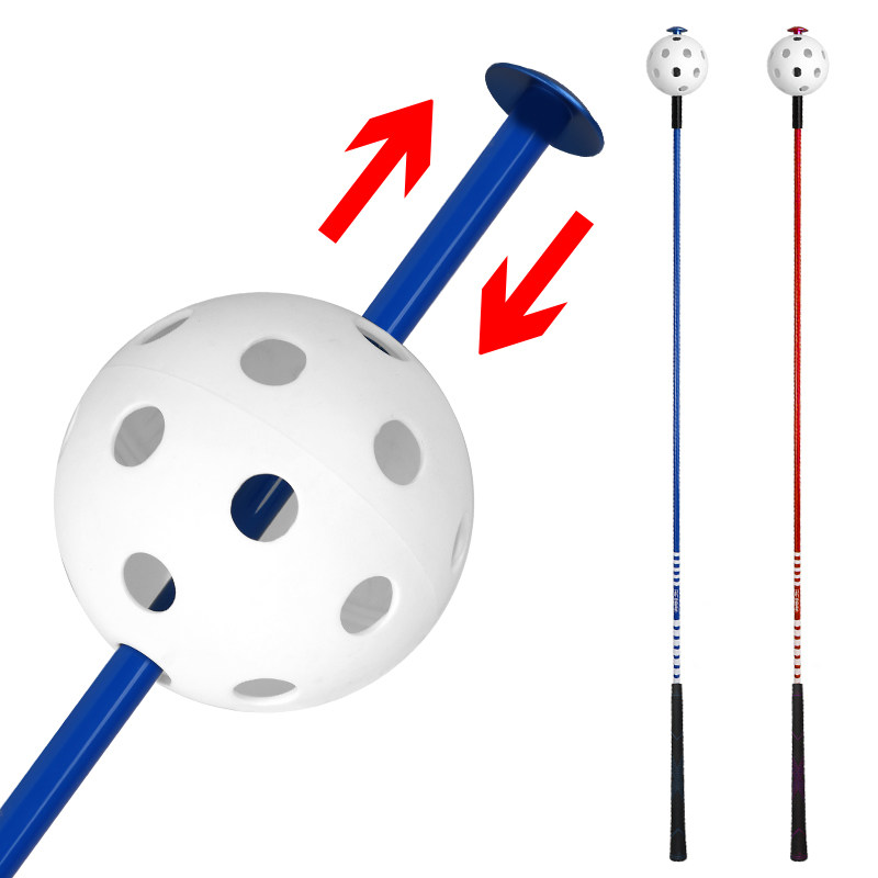 棒の先端には穴あきボールが付属し、室内でも安全に練習可能です。